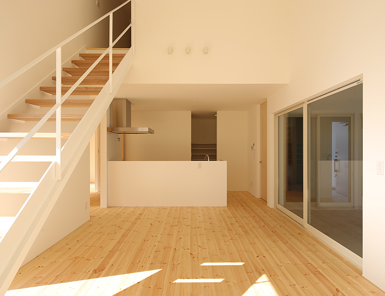 南側からの光にこだわり過ぎてしまうと、カーテンを閉め切った場合、家の中は暗くなってしまいます。SIMPLE NOTE(シンプルノート)では、日の光を南からはもちろん、家全体から採り入れる設計になっています。家の要所にある、外からの視線が入らないフロストガラスや吹き抜け、計算された反射光によって、自然で心地の良い光が家全体を包み込みます。